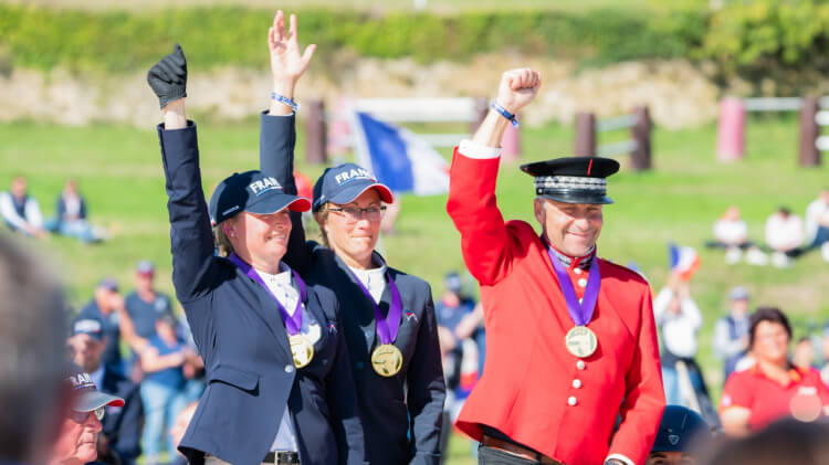 Championne du Monde par équipe la France s’impose sur ses terres, composée de trois couples : Marion Vignaud aux guides de FIRST QUALITY, Claire Lefort et DARWIN DE FELINE et enfin Fabrice Martin menant LANZARO*IFCE. Finissant avec 267,9 points, la France devance les Pays-Bas avec 281 points et l’Allemagne avec 291 points.