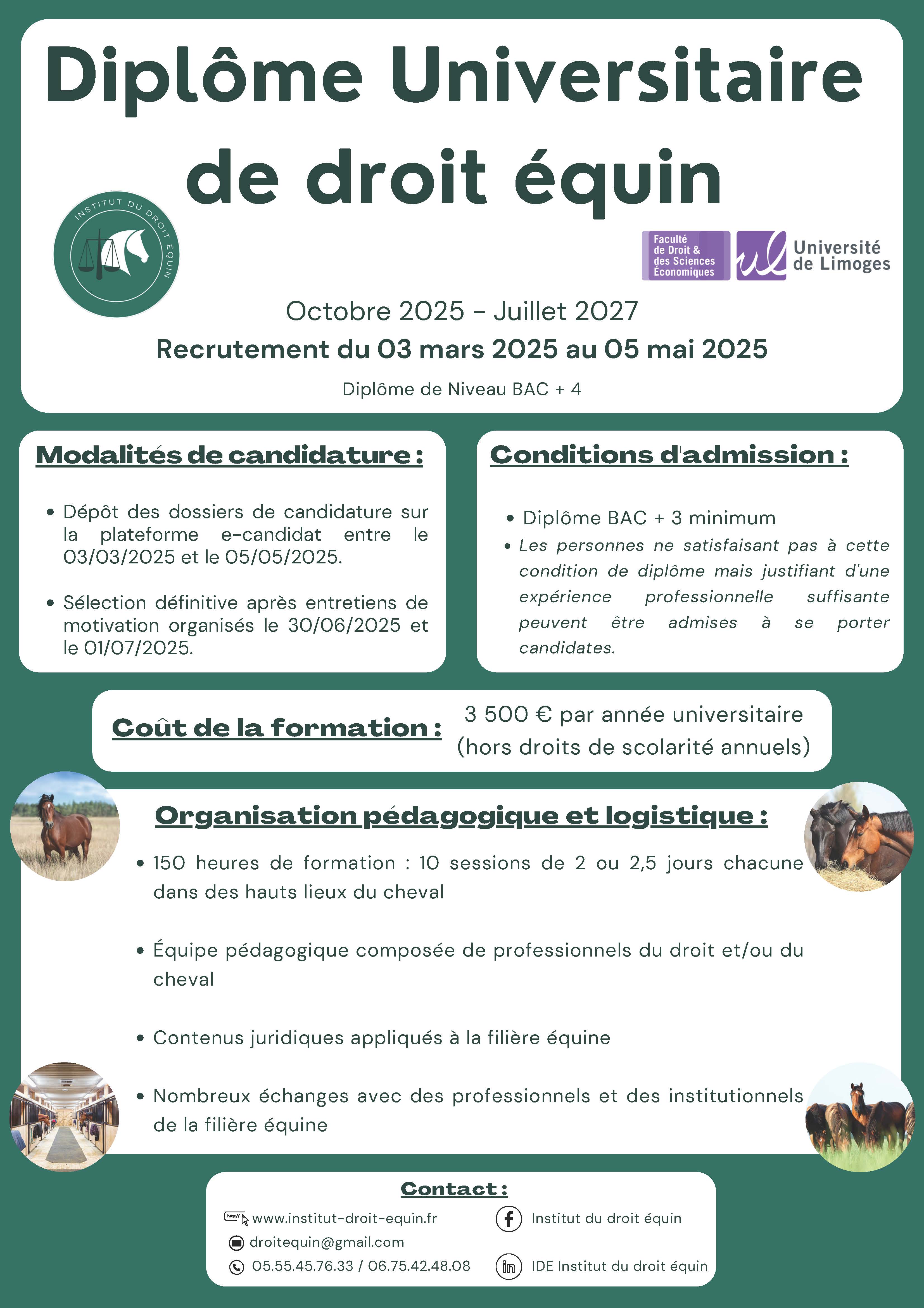 Le Diplôme Universitaire de droit équin (DU) est porté par l'Institut du Droit Equin et l'Université de Limoges.