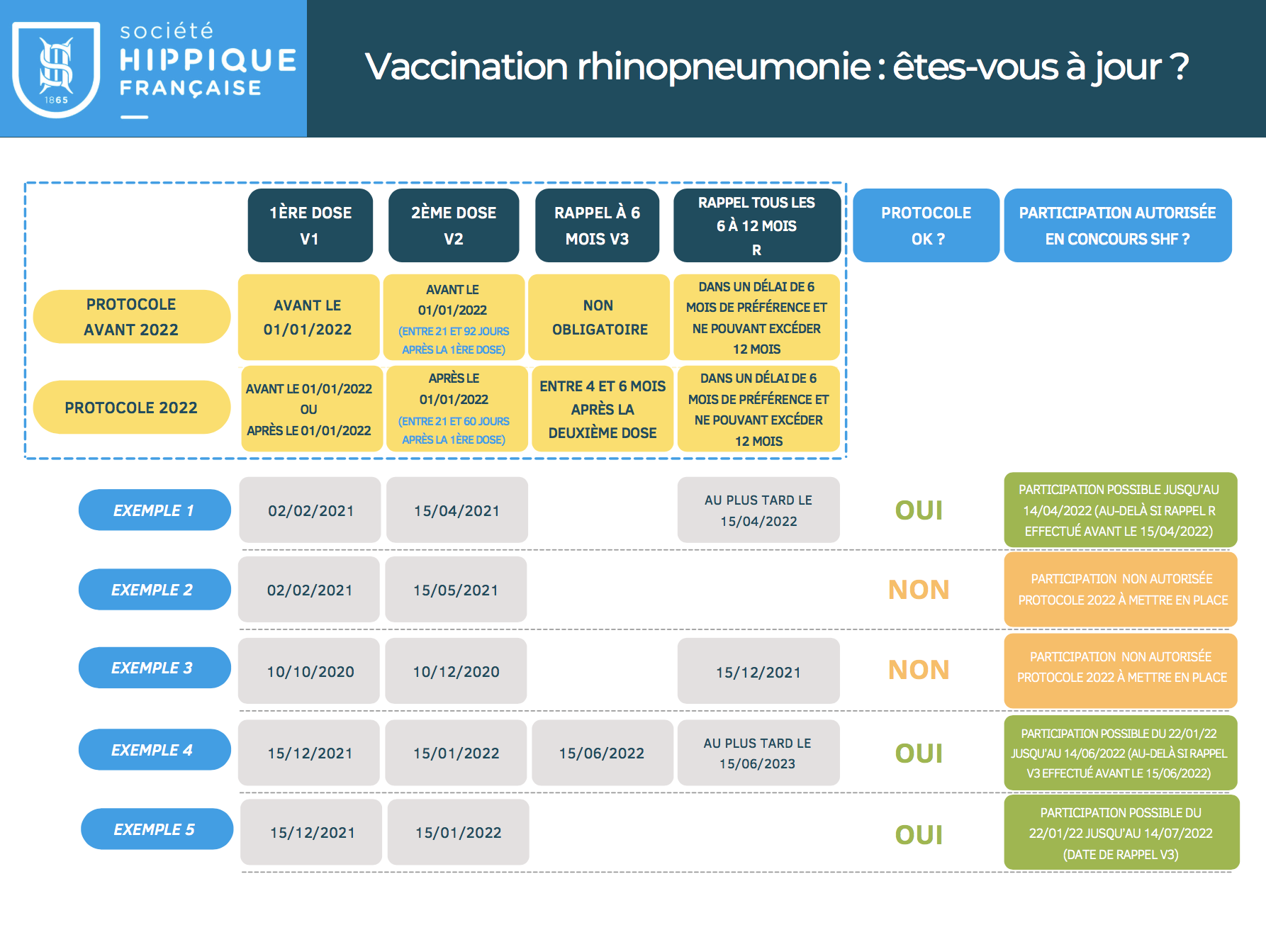 Dans le cadre du protocole SHF, les chevaux dont la primovaccination est antérieure à 2022, sont considérés comme « vaccinés contre la rhinopneumonie » dès lors qu’ils ont eu une primovaccination avec 2 injections entre 21 et 92 jours et des rappels ultérieurs n’excédant pas 12 mois d’intervalle. En cas d’interruption ou oubli de rappel, ils doivent être à nouveau vaccinés et suivre le protocole ci-dessus.