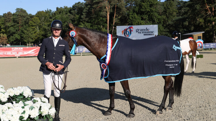 Vice-championne, avec un score final de 15.26 (label Excellent) la jument pie baie Look at Me du Mille, sf, fille du KWPN Ustinov, et de Cinderella Ess, sf par Roccossifred, sf, née au Haras du Mille à Val de Moder (67), aux rênes d’Adriano Cusenza, basé à Chantilly au sein d’une écurie d’une quarantaine de chevaux de propriétaires et de valorisation, spécialisée dans le saut d’obstacles. « Look at Me appartient à mon père Rosario. Nous l’avons achetée cet hiver. En 2024 elle avait remporté le local et le régional du Grand Est, et se classait dixième du championnat des juments de trois ans du Stud-Book Selle Français. Elle a également couru la finale des quatre ans de CSO. Elle n’a effectué que deux parcours de Hunter cette année. Nous avons beaucoup d’offres d’achat, mais nous souhaitons la garder pour le moment, pourquoi pas à l’avenir pour notre élevage d’Idella, dont les produits naissent chez Adeline et Yannick Remacly à l’élevage du Pont Gaudron à Laneuville sur Meuse (55), où l’un de nos foals a remporté le local voilà un mois » explique le cavalier.