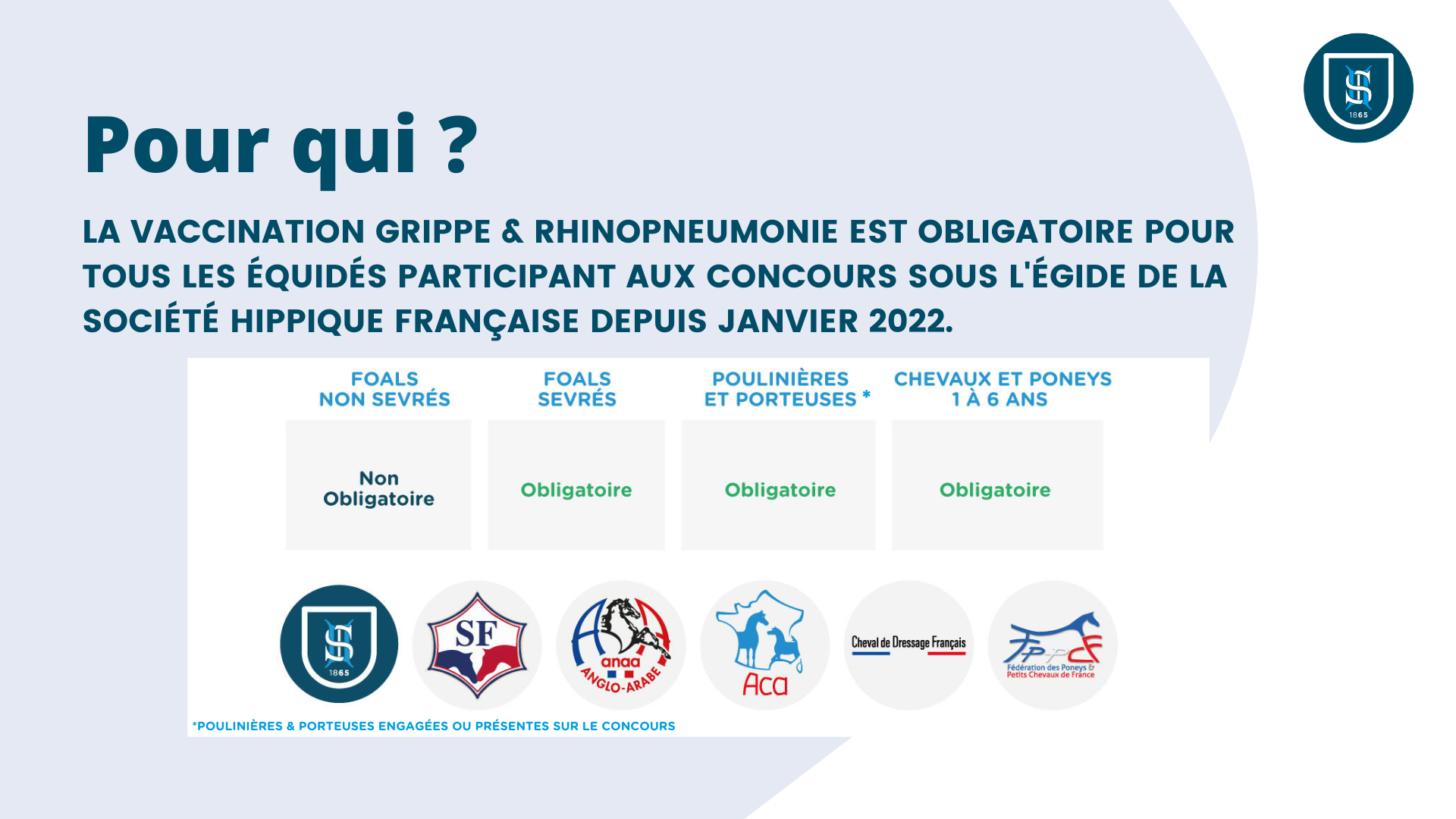 Début 2022, la Société Hippique Française a rendu obligatoire la vaccination contre la rhinopneumonie équine et la grippe pour participer à une épreuve organisée sous son égide.