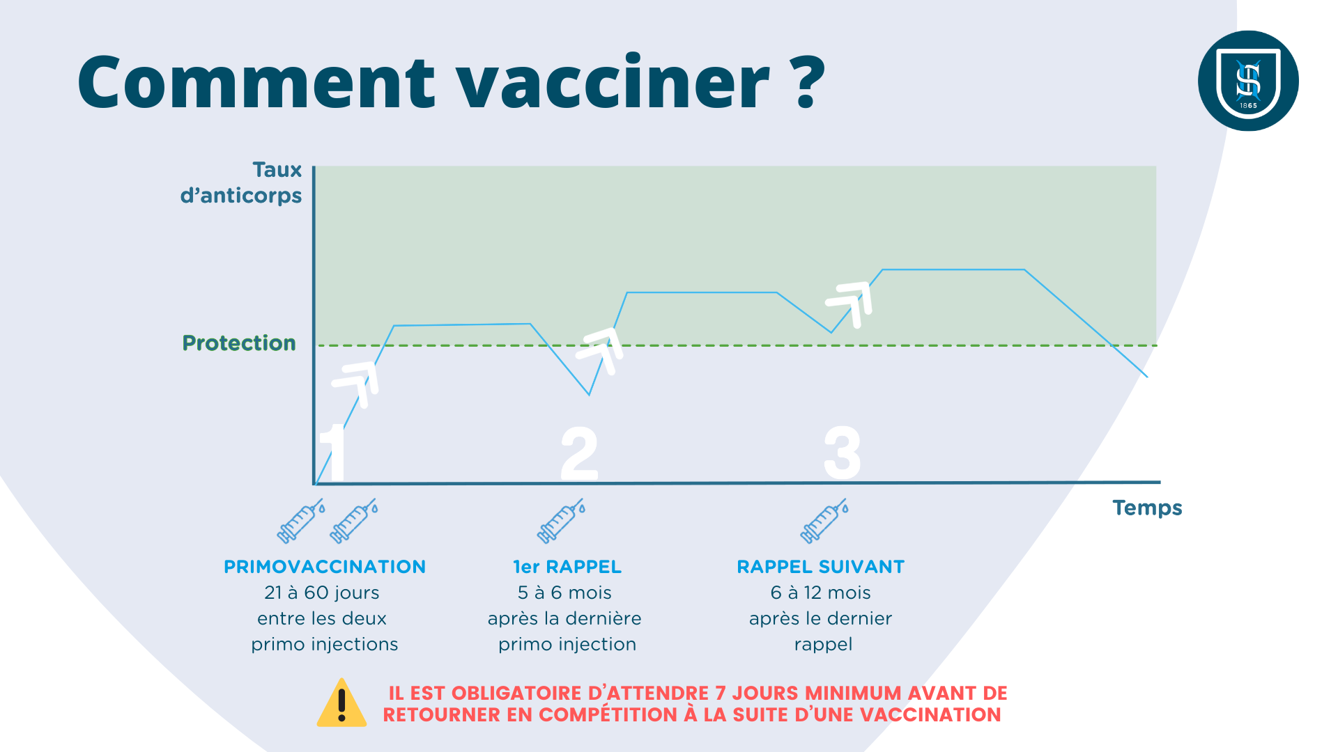 Pour participer à une épreuve SHF, l’équidé devra avoir reçu à minima les deux injections de primovaccination. La dernière injection devra avoir été faite au minimum 7 jours avant le 1er jour de compétition.
